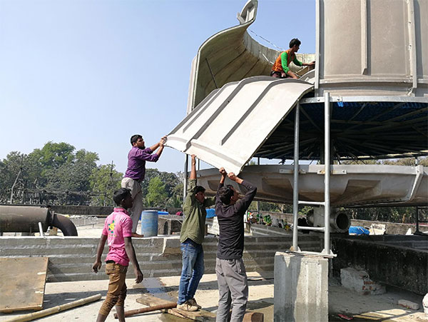 冷却塔的处理水能力450T/H,进水温度37℃,出水温度32℃,圆式玻璃钢冷却塔