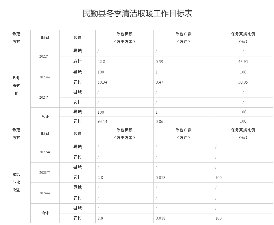 2023年度(2023年5月—2024年4月)完成热源清洁化改造150.34万平方米(其中:县城100万平方米、农村50.34万平方米);完成既有建筑节能改造2.8万平方米。